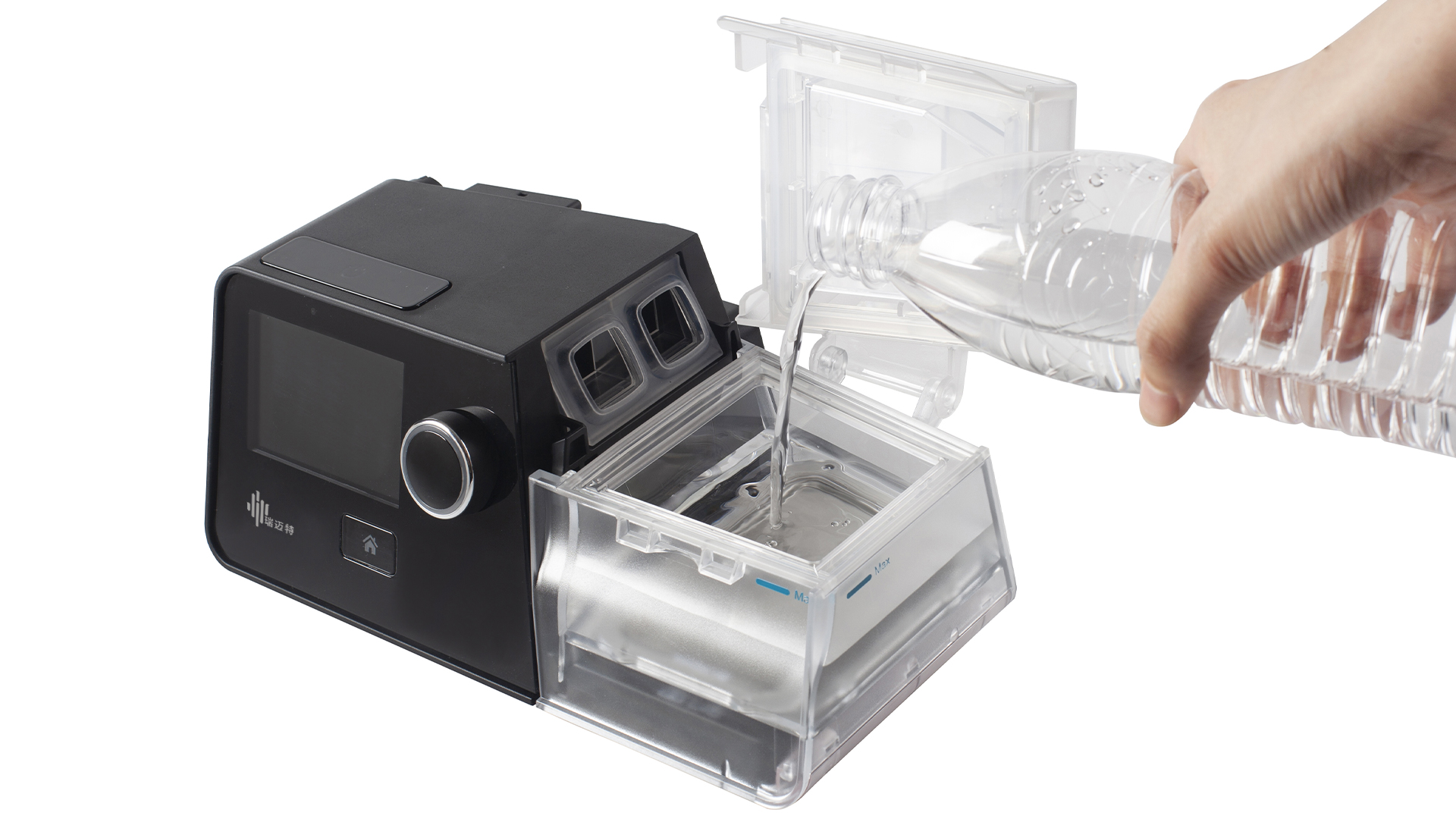 每天更换湿化罐中的水,以新鲜的蒸馏水或纯净水为宜,保持气道湿润健康,注意不要超过指示的最大水位线。